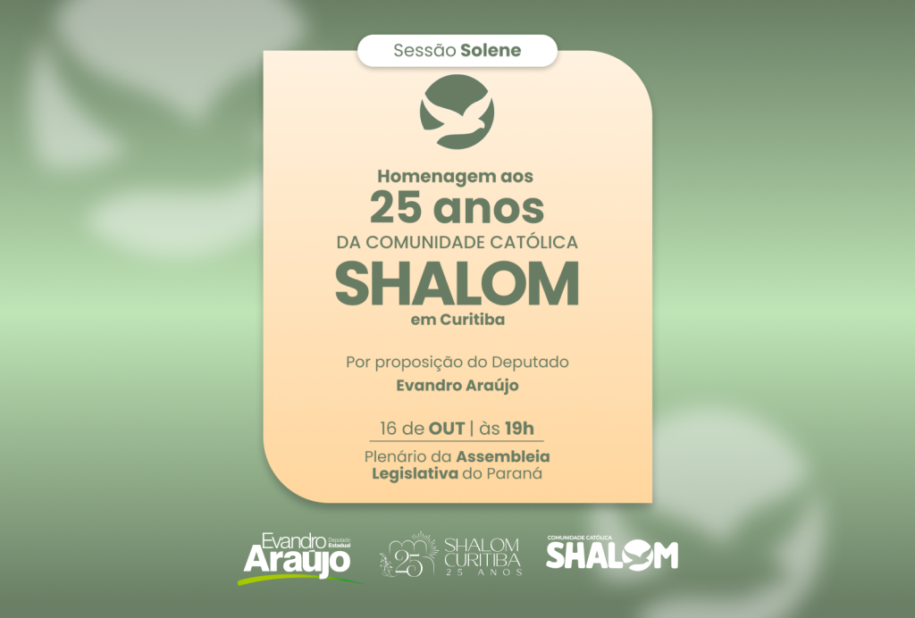 A Assembleia Legislativa do Paraná realiza, nesta quinta-feira (16 de outubro), às 19h, uma sessão solene em homenagem aos 25 anos da Comunidade Católica Shalom em Curitiba. A iniciativa é do deputado Evandro Araújo e reunirá autoridades civis, religiosas e membros da Comunidade Shalom, que há 25 anos desenvolve um importante trabalho de evangelização, formação […]